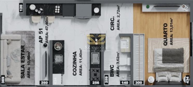 - Apartamento 01 Quarto: 47,40m2;