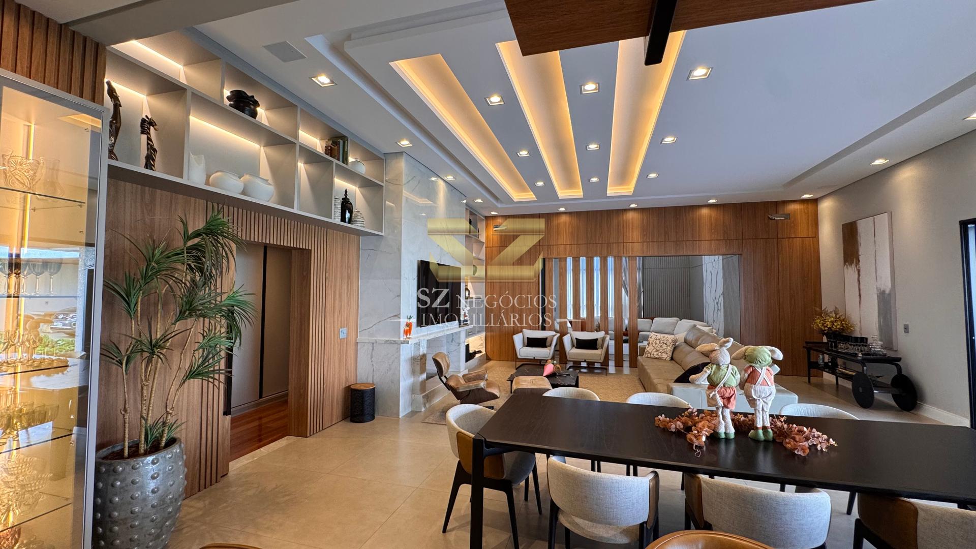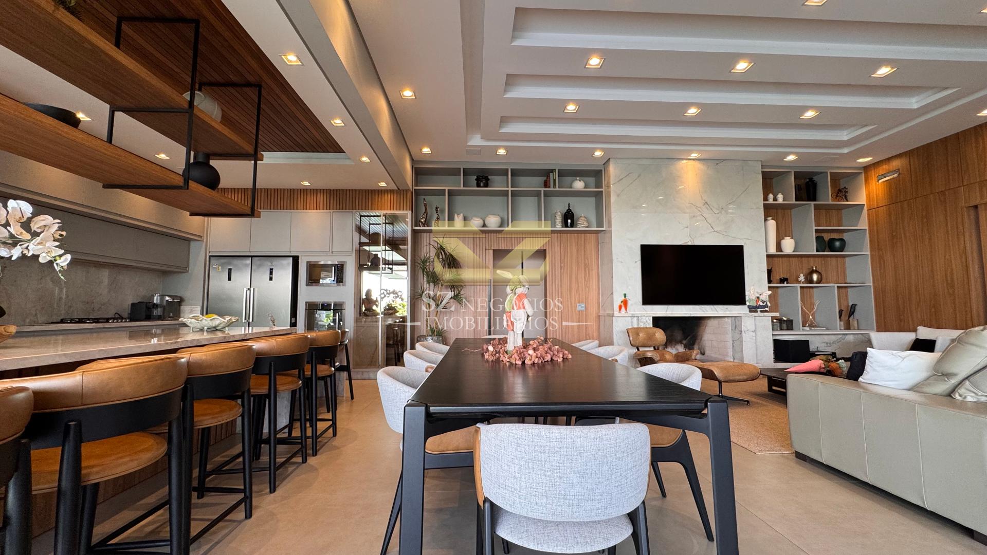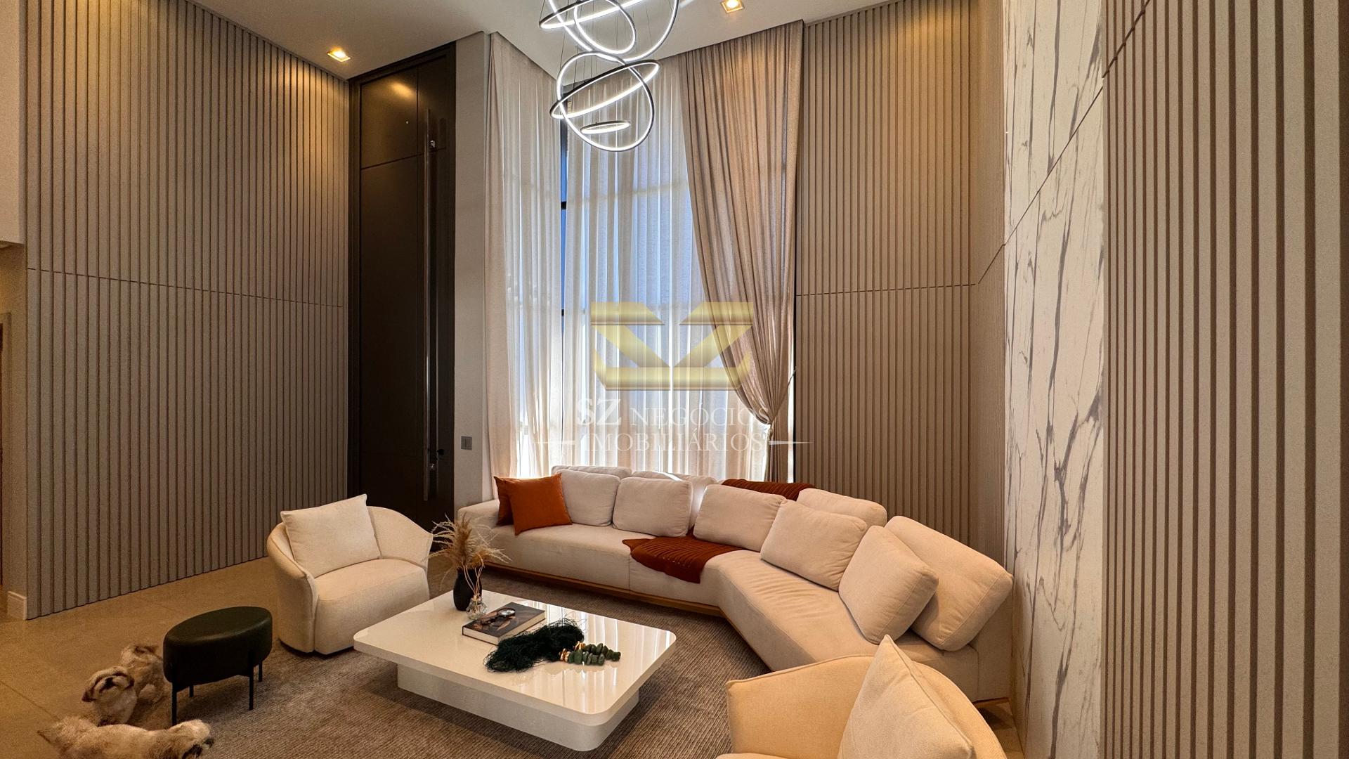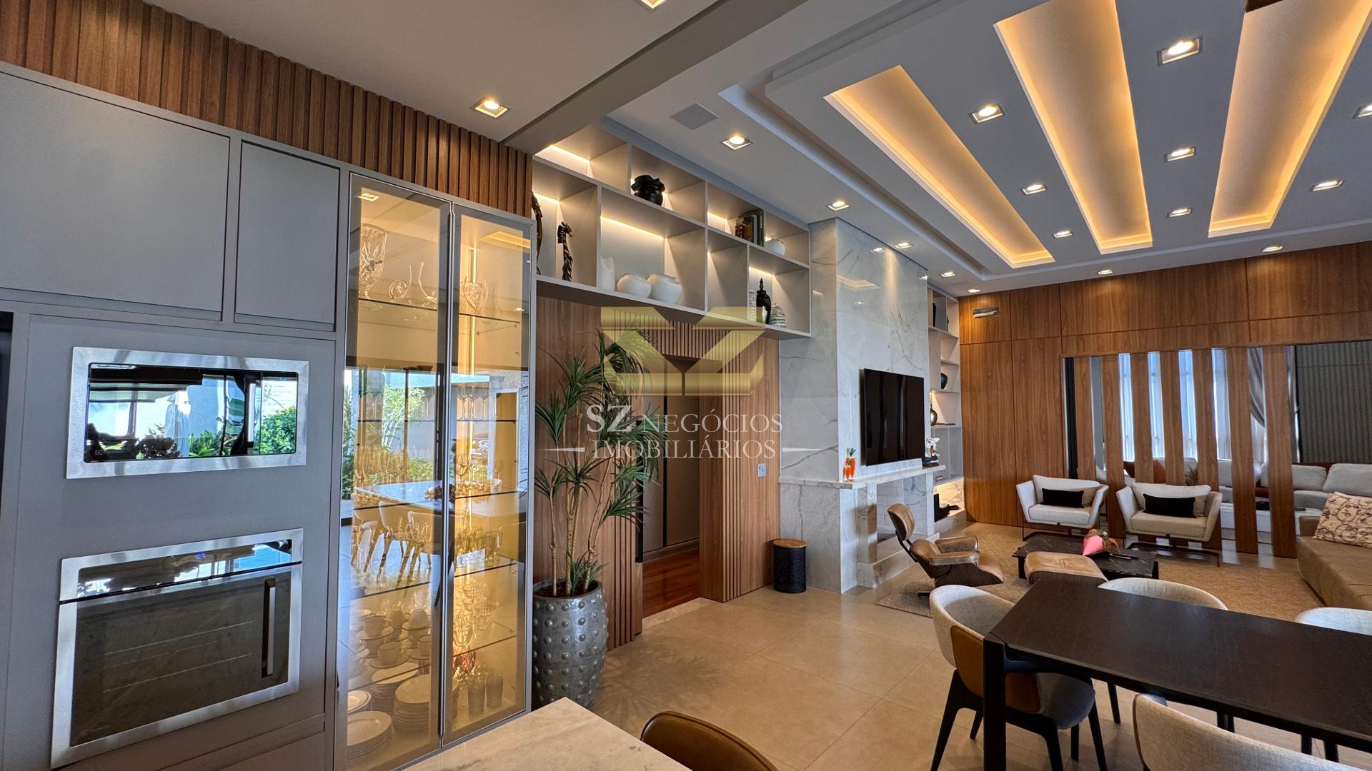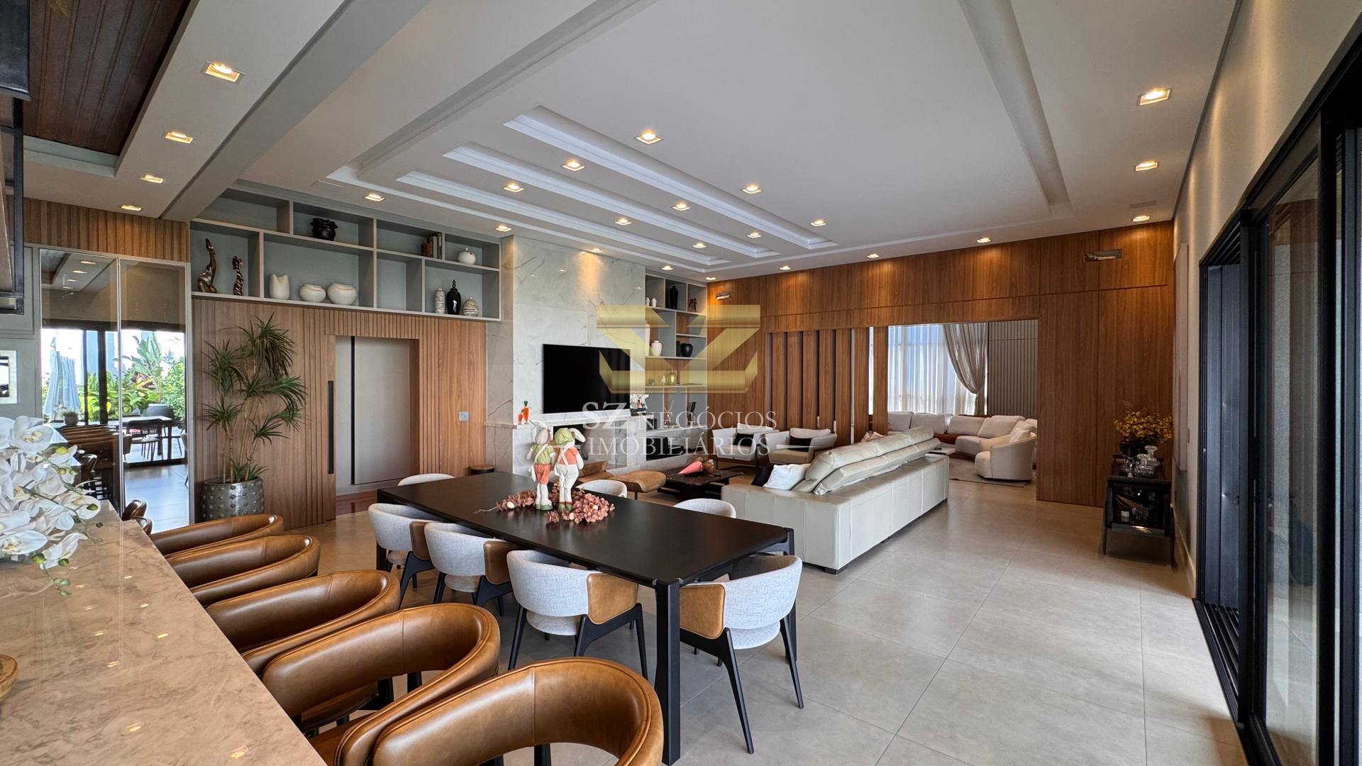 A área social é composta por uma ampla sala de estar com pé-direito alto, acabamento refinado e mobiliário completo, além de uma elegante sala de jantar equipada com móveis planejados.