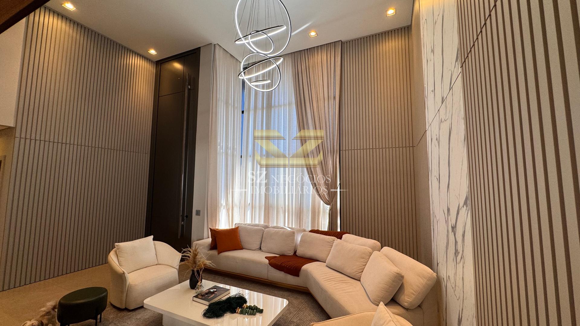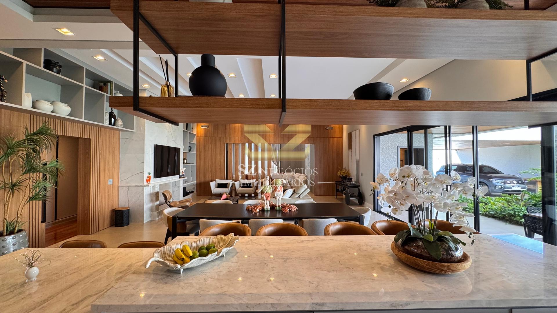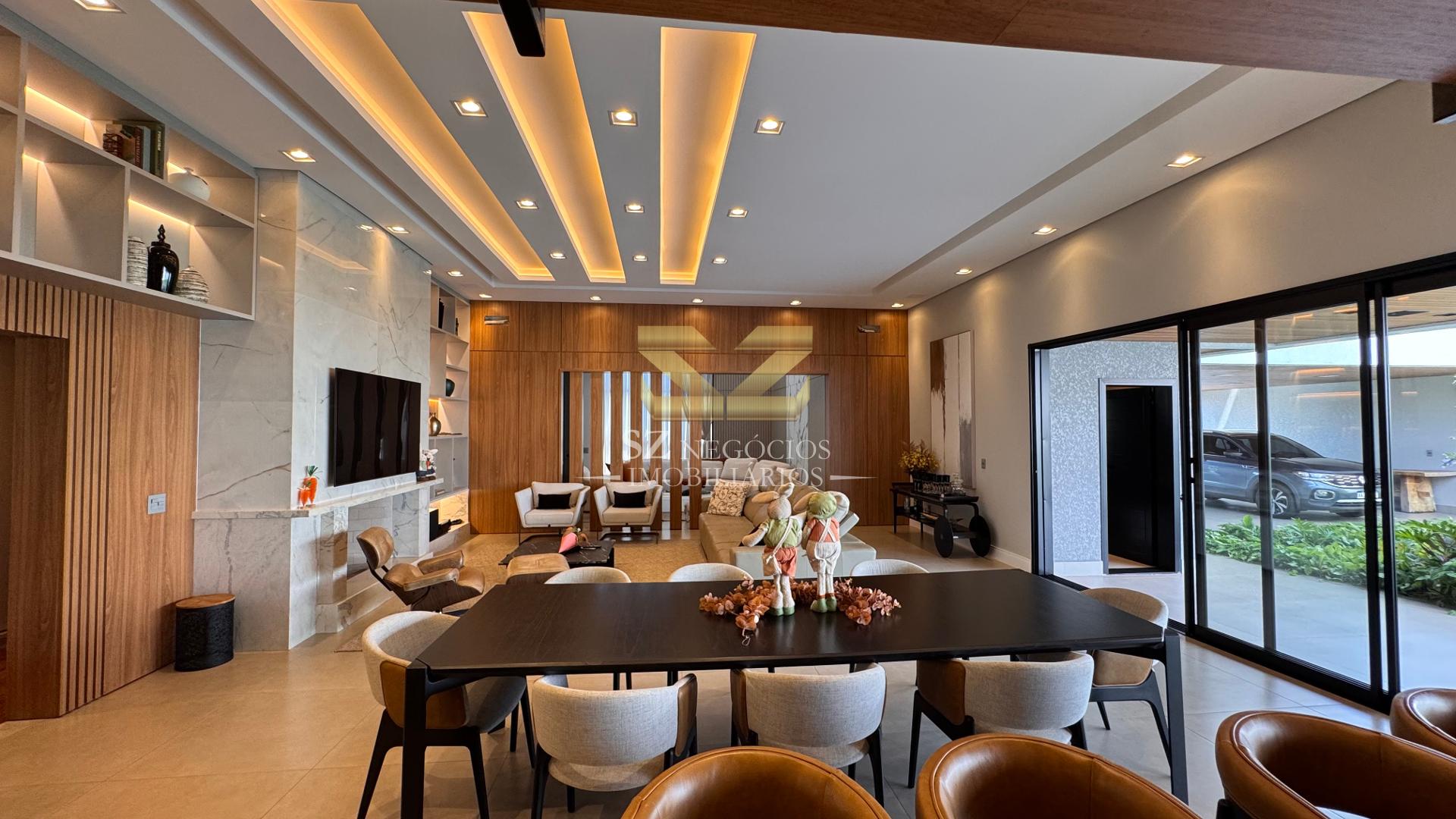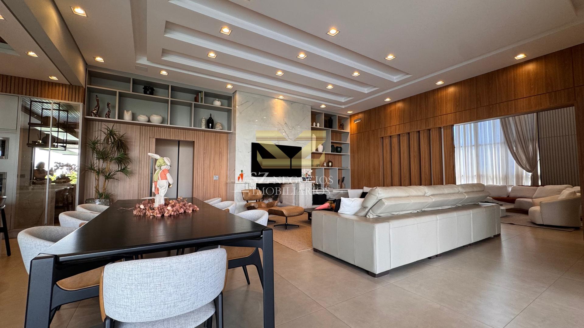 A área social é composta por uma ampla sala de estar com pé-direito alto, acabamento refinado e mobiliário completo, além de uma elegante sala de jantar equipada com móveis planejados.