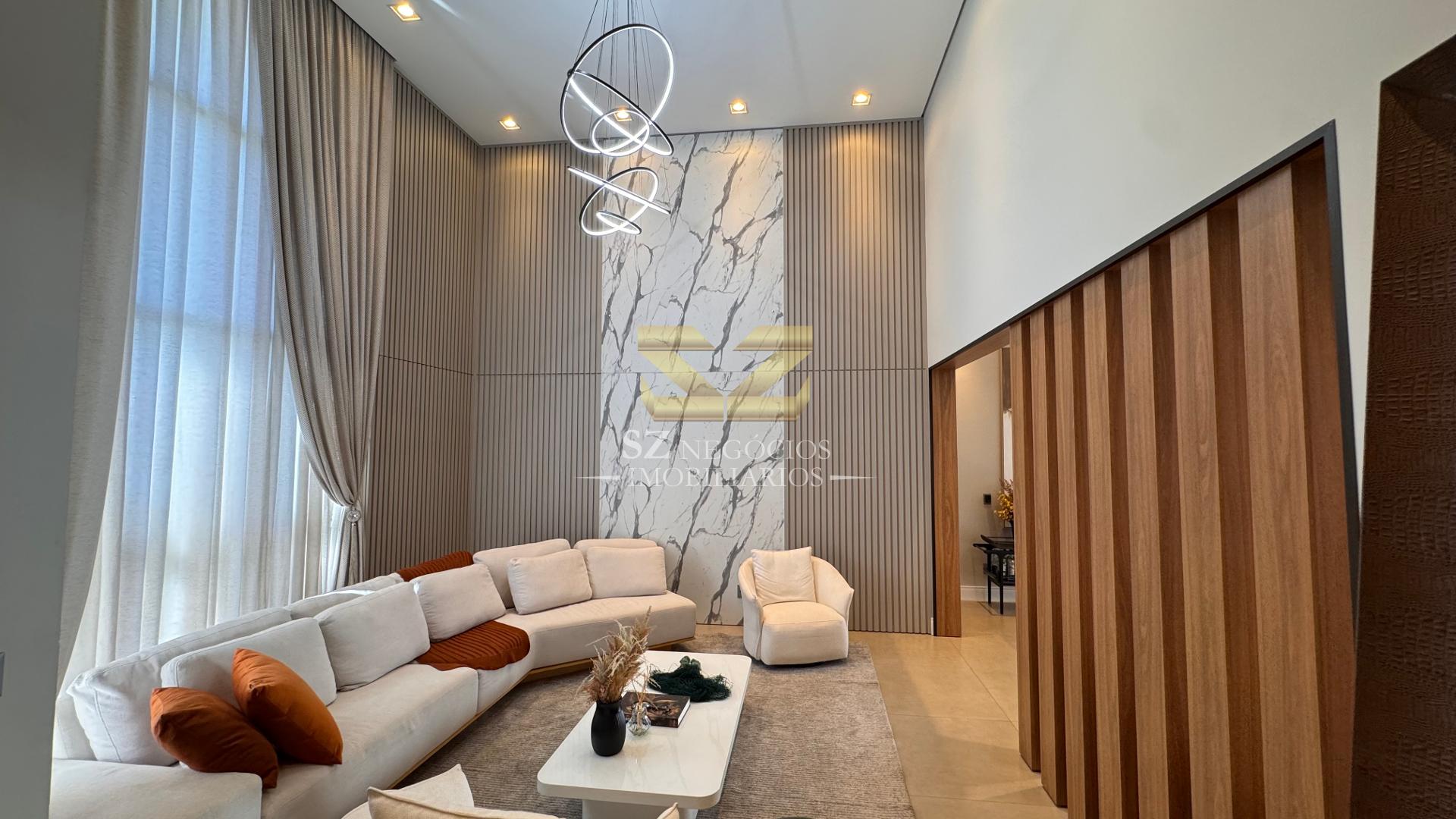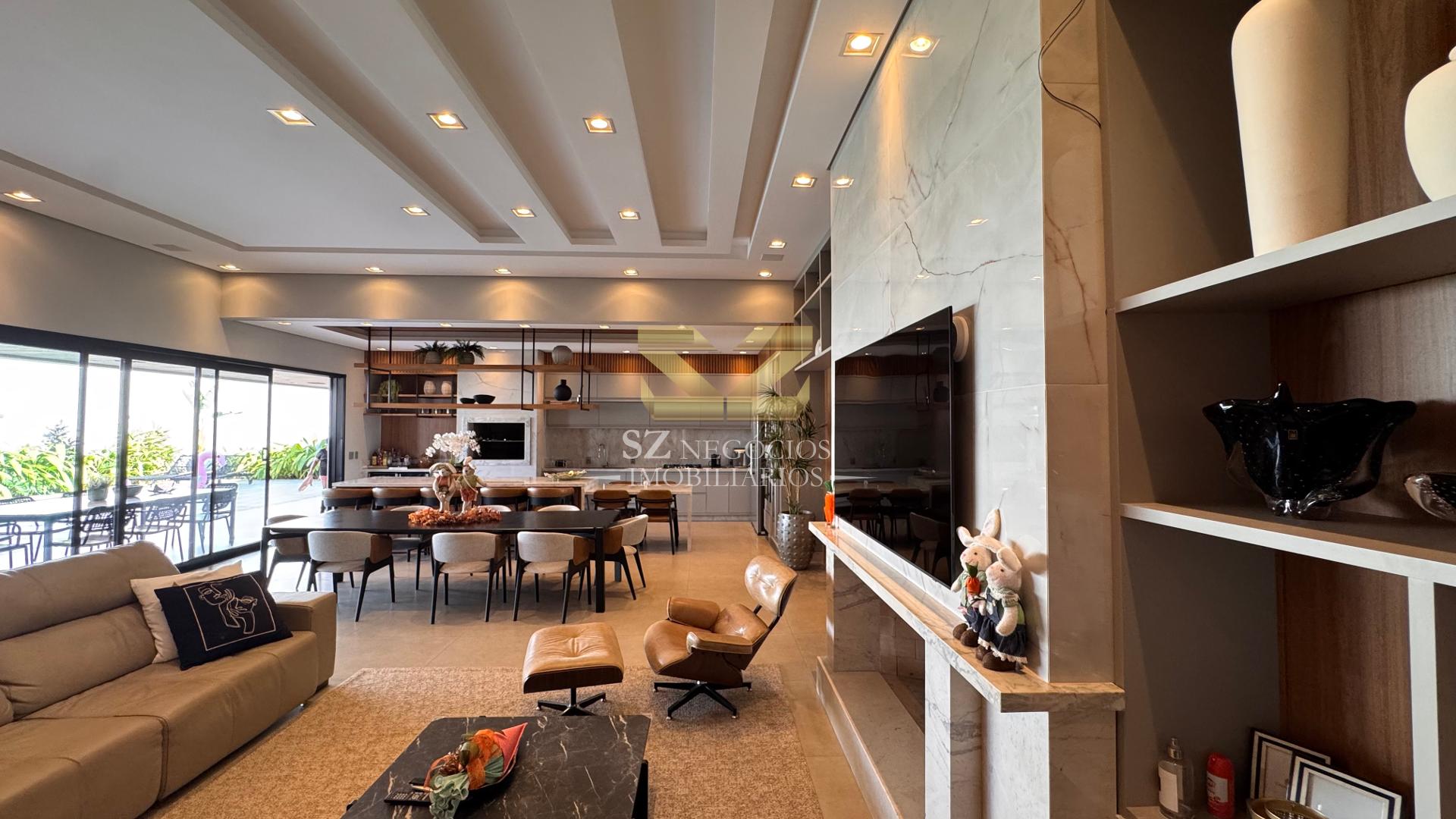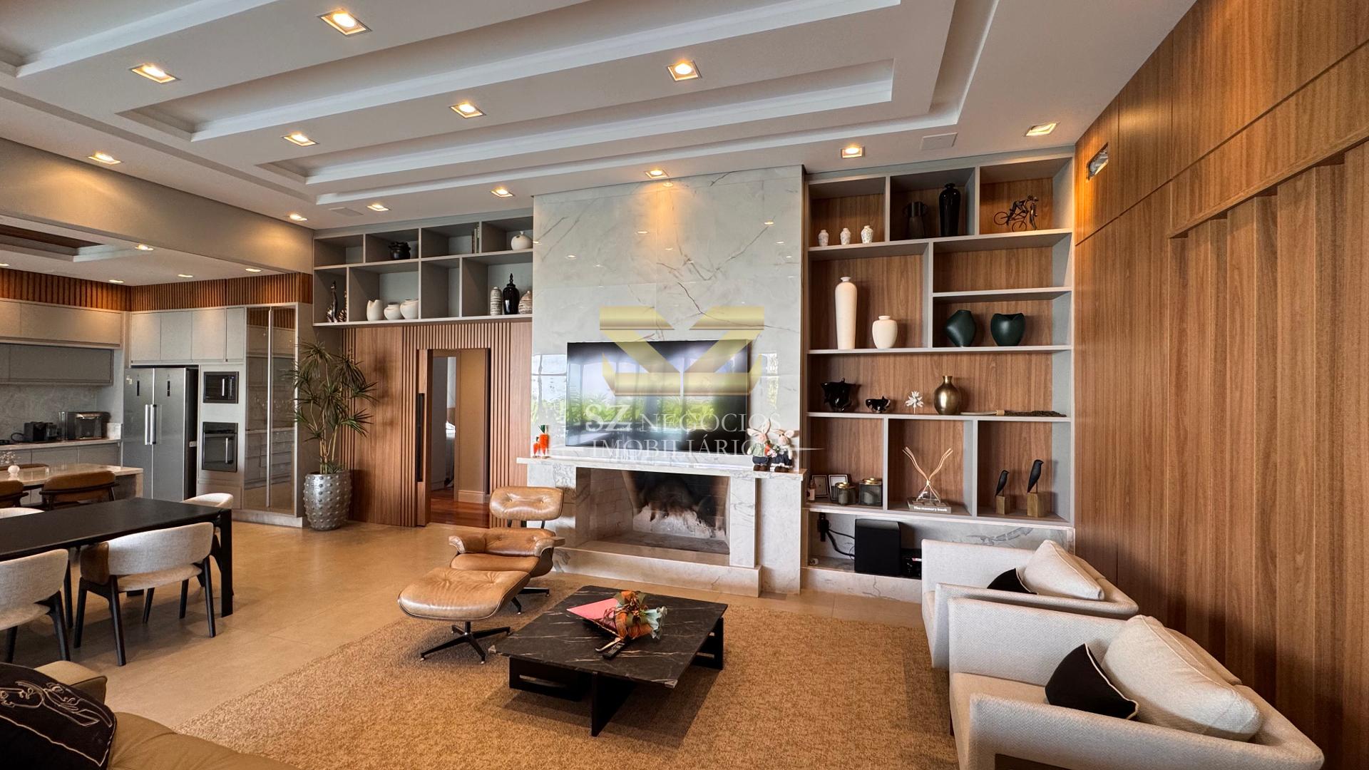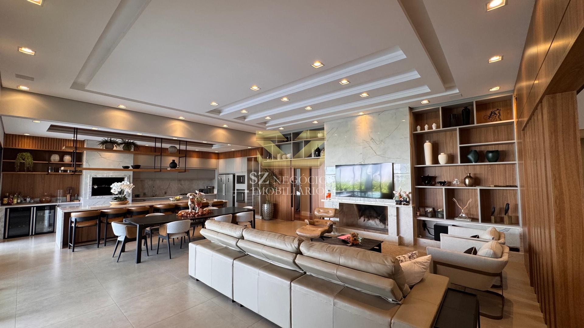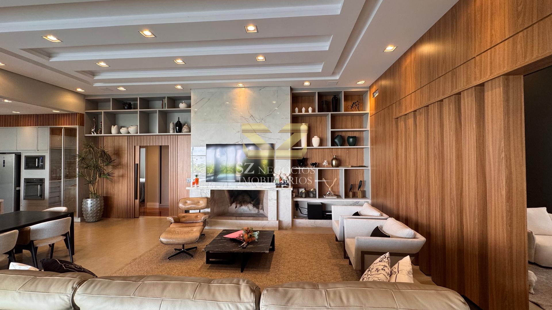A área social é composta por uma ampla sala de estar com pé-direito alto, acabamento refinado e mobiliário completo, além de uma elegante sala de jantar equipada com móveis planejados.