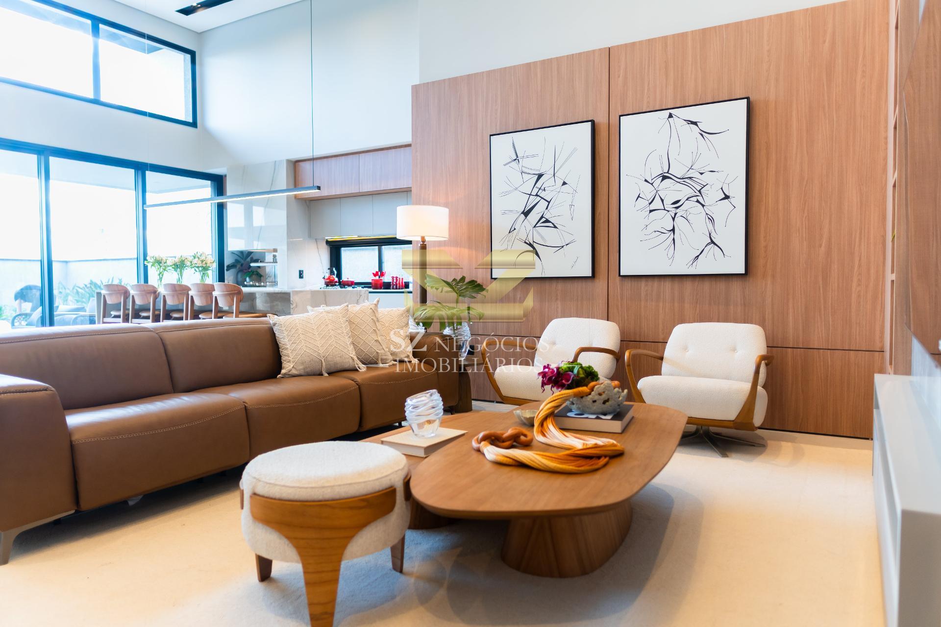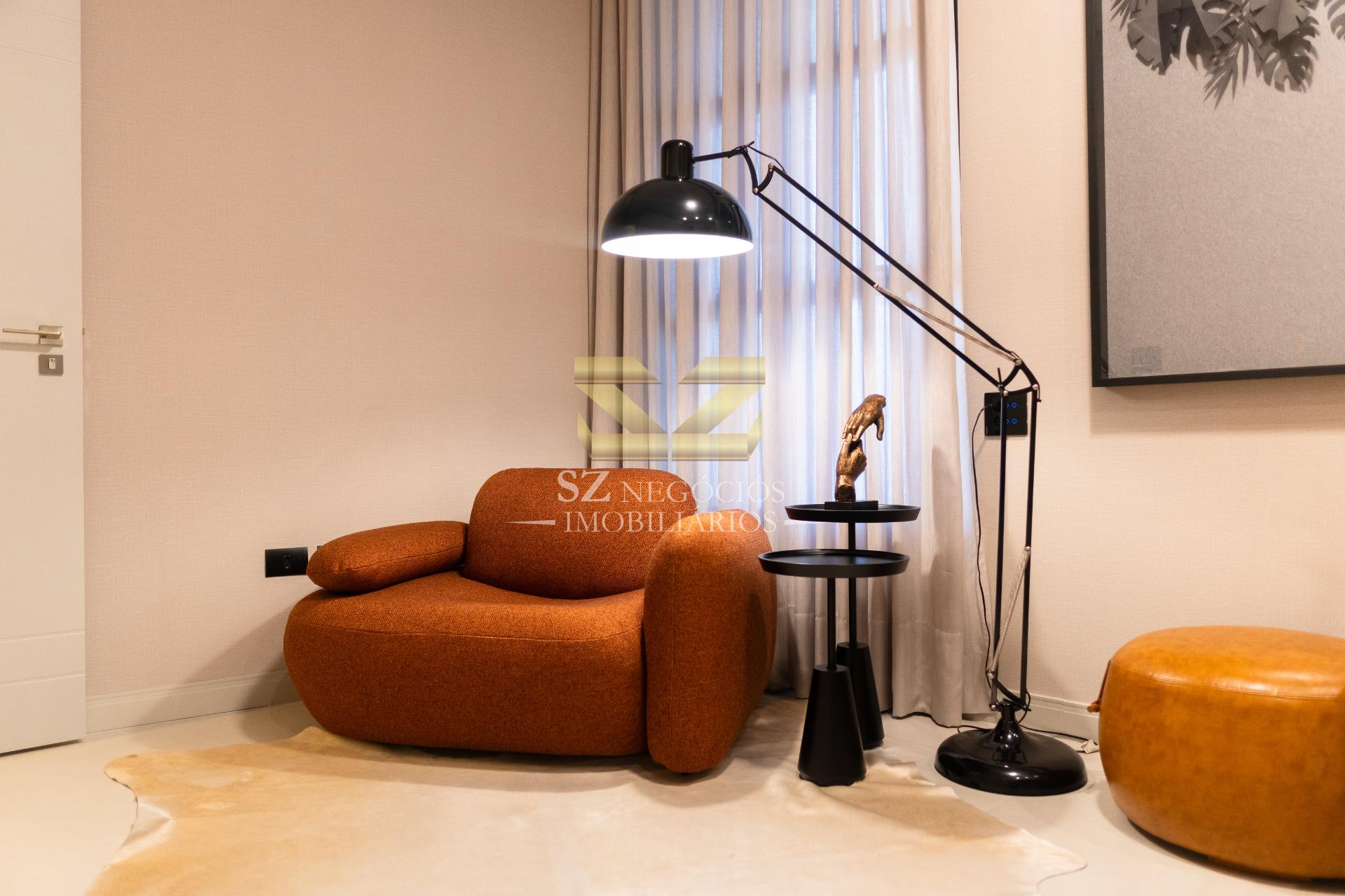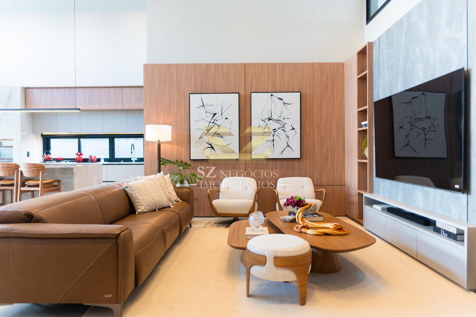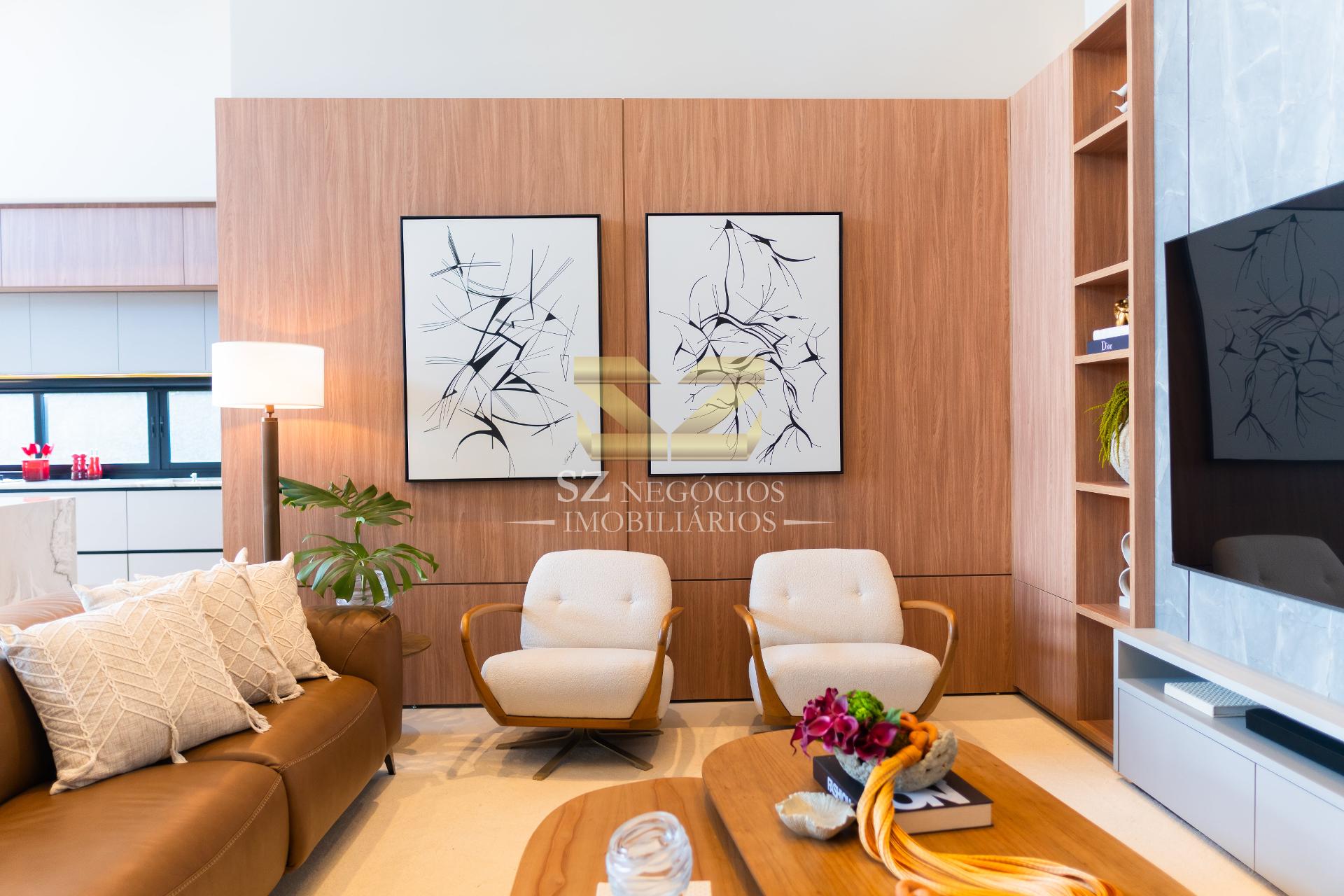 A área social integrada com sala de estar (com TV de 85 e sofá Natuzzi), sala de jantar e espaço gourmet, todos planejados para momentos de convivência e recepção com charme e conforto.