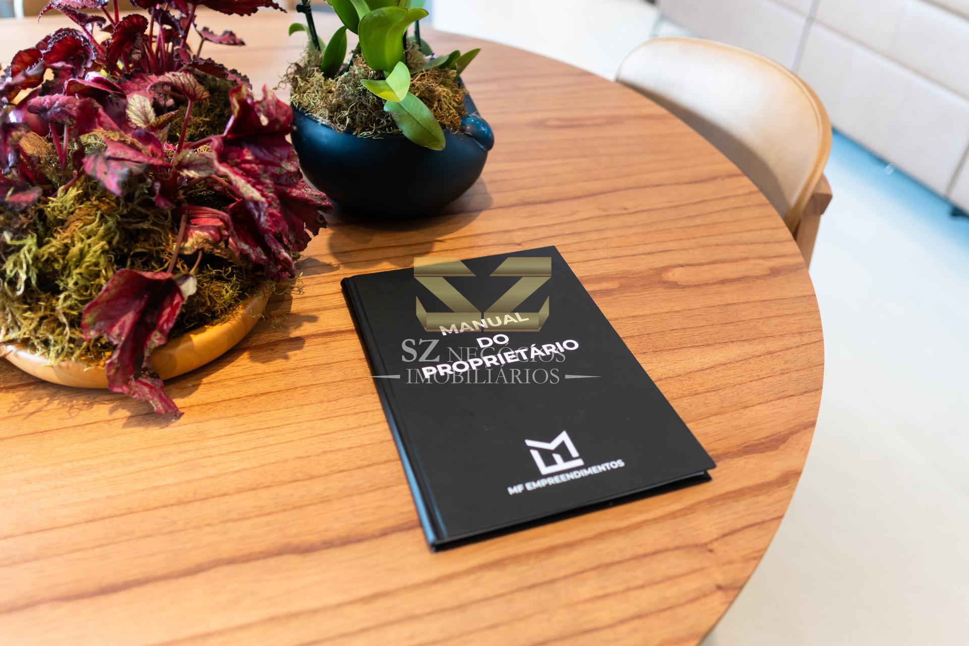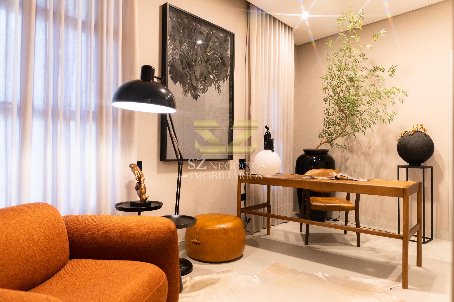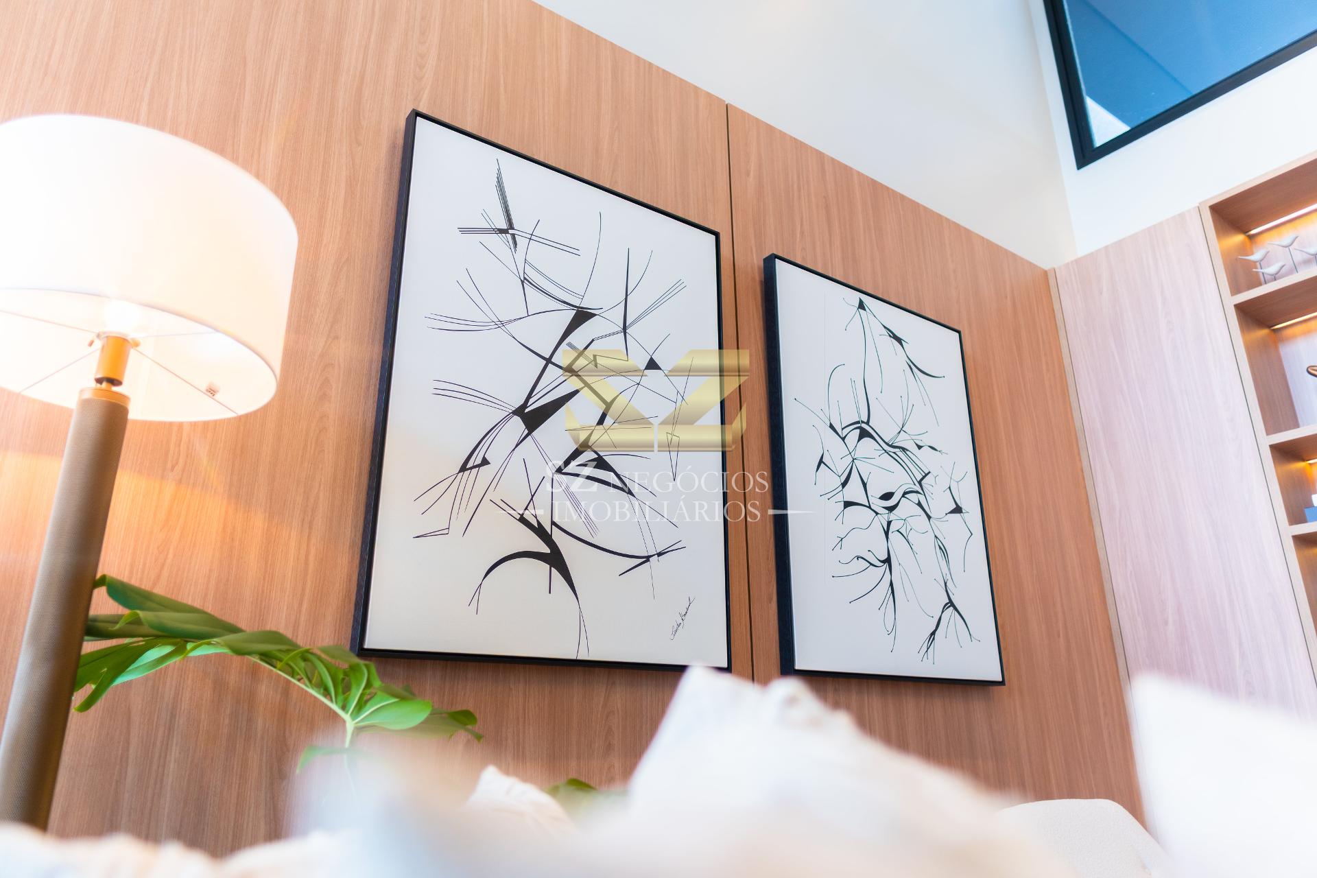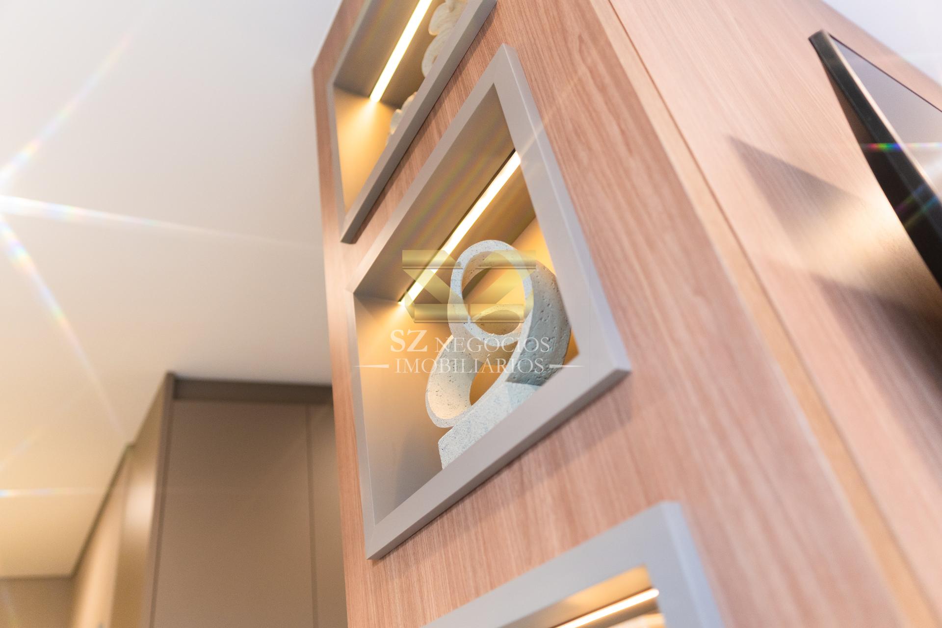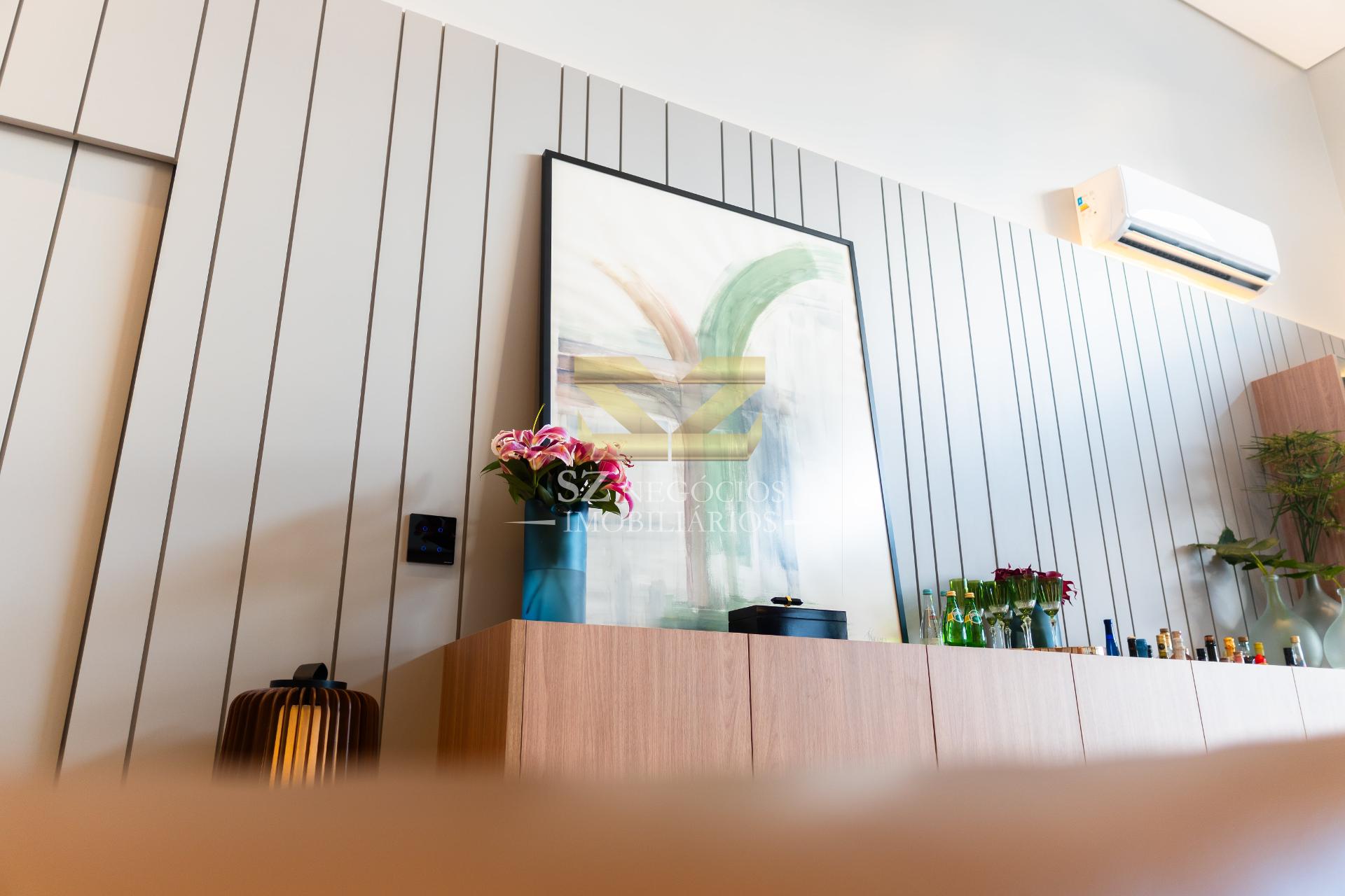 A área social integrada com sala de estar (com TV de 85 e sofá Natuzzi), sala de jantar e espaço gourmet, todos planejados para momentos de convivência e recepção com charme e conforto.