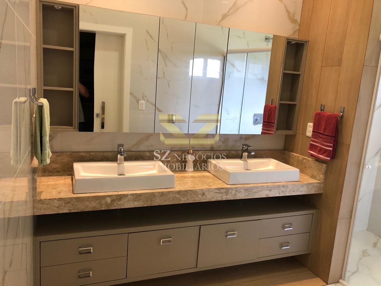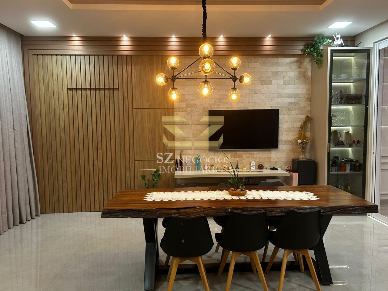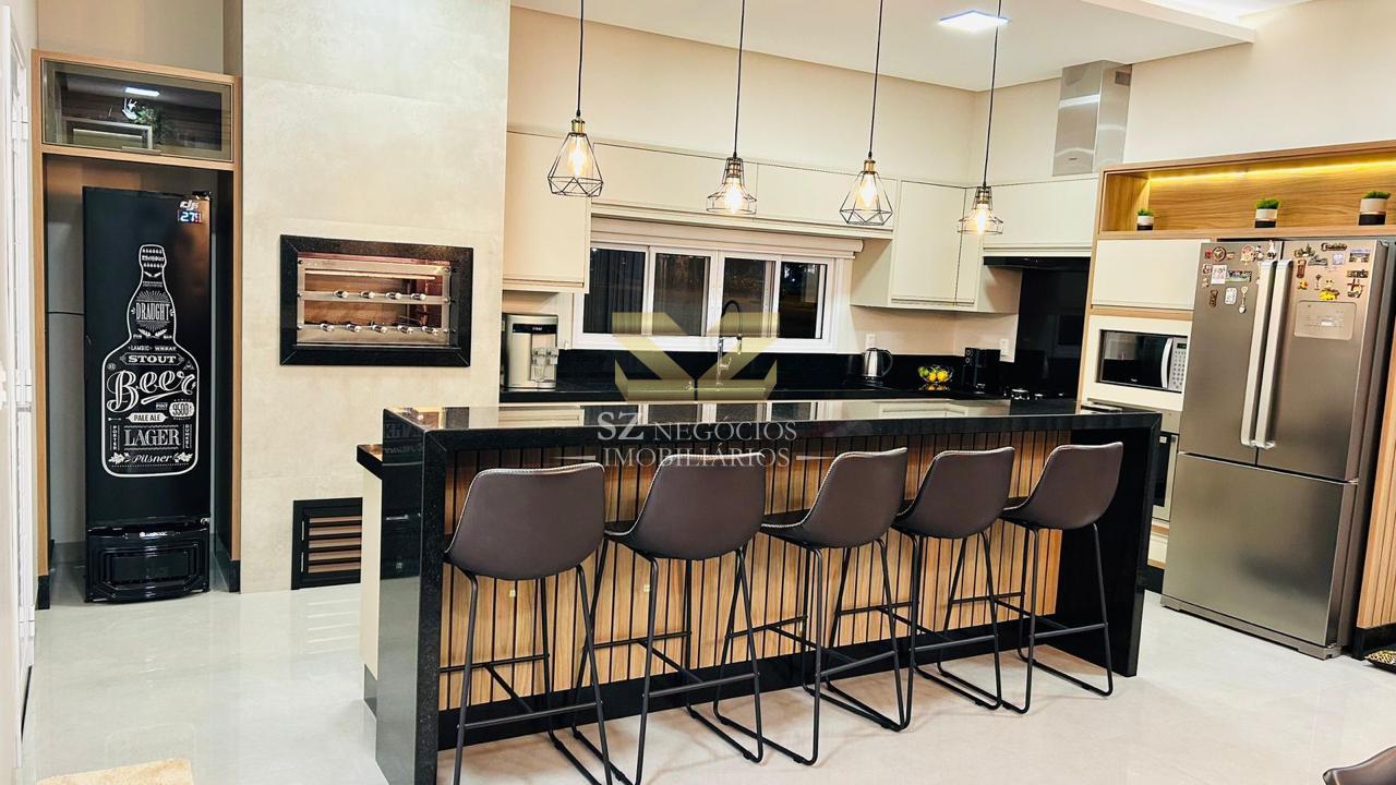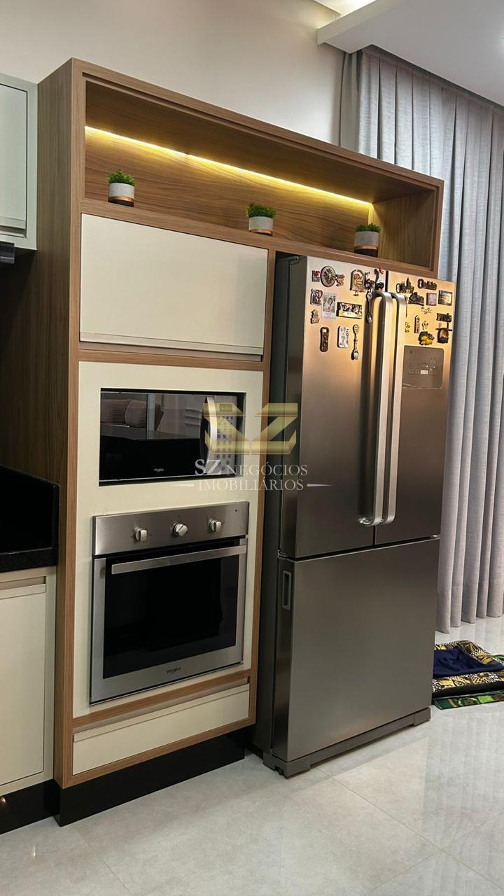 - Cozinha/área gourmet (móveis planejados, bancada em granito São Gabriel, geladeira Whirlpool de 554 litros, micro-ondas, forno, coifa, churrasqueira elétrica Tecnogrill, refrigerador expositor);